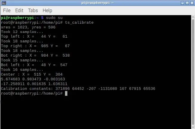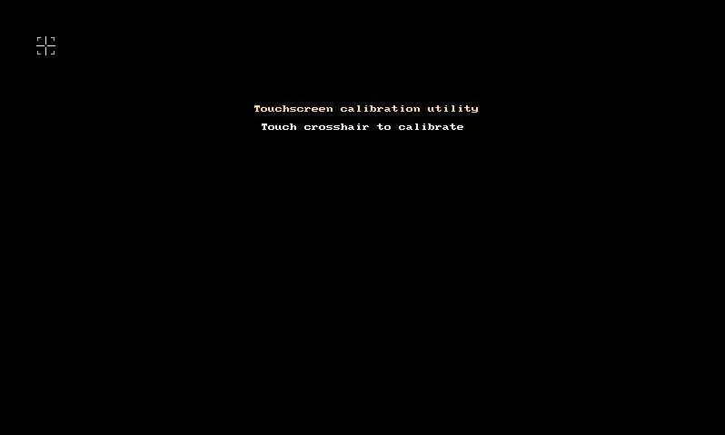 Now we can run the calibration test. To do this enter the ts_calibrate command in the Terminal. You will need to be in super user mode for the calibration test to run. A screen will pop up asking you to touch five different points on the screen, try to touch them as accurately as possible. After the test is finished a list of the results will be displayed in the Terminal.