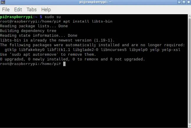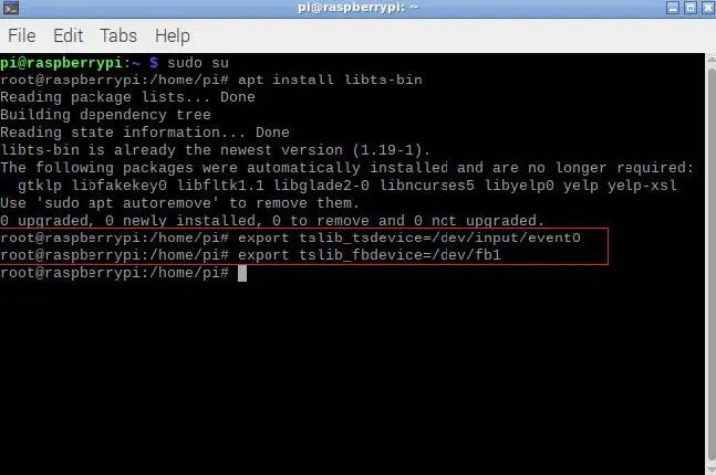 Next, we find the program that calibrates the display. There are a few options of programs that calibrate the touch setting, the one I will be using is called ts_lib. We can install this through the Terminal. Root privileges will need to be enabled to install the program that is used. Enable super user mode by entering: