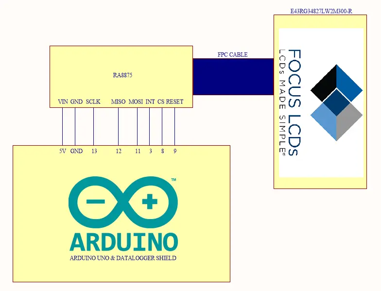 - The RA8875 CS (Chip Select) pin is connected to pin 8 of the Arduino.