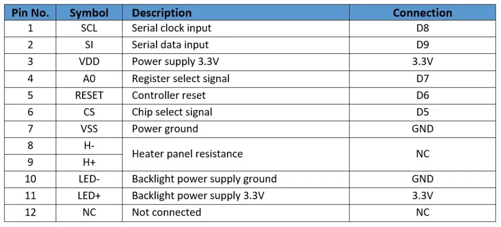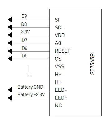 Below is a diagram representing the pin connections to the microcontroller in accordance with the table above. The pins labeled ‘D’ represent the digital pin terminals on the microcontroller. All unused pins are connected to ground. The diagram represents the 4-wire serial communication interface between the microcontroller and the displays internal IC controller. The backlight LED circuit is connected to an external battery and not powered by the microcontroller. An additional variable resistance can be added between the backlight terminals to adjust the backlight current to dim or brighten the LEDs.