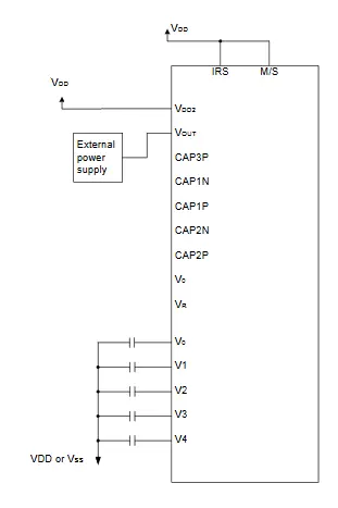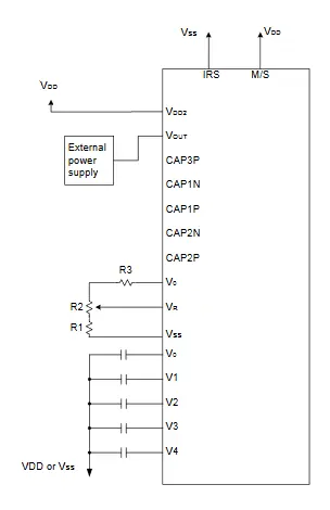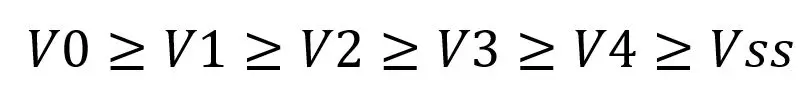 While these conditions can be met by applying different voltages to each of the (V0-V4) terminals, as seen in Figure 1, it is recommended to use the on-chip voltage follower circuit to change the impedance to provide these voltages (V1-V4) internally. The voltage V0 is produced by a resistive voltage divider which can be applied internally or externally. (Figure 2 & Figure 3)