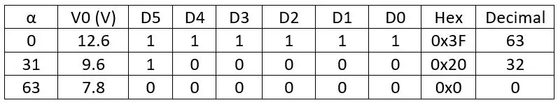 These values will be instantiated as hexadecimal or binary values when programming of the display. The electron volume register is 6-bits stored in D0-D5. The electronic volume would be (D5,D4,D3,D2,D1,D0) = (1,0,0,0,0,0) at α =31. It is important to note that the binary register value does not equal the decimal α value. This is further explained in the following table.