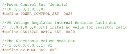 Above are the generic values without changes to the power supply circuits, resistor ratio or electronic volume. In the .c file we can add the values using the bitwise operator. This can be seen below with the specific values for this example.