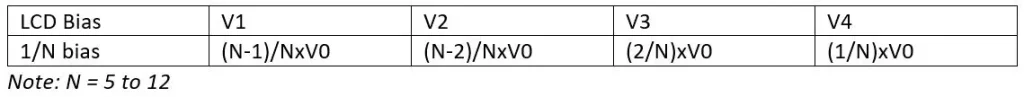 It is necessary to provide the LCD driver 9.60 V to operate. This can be done with the voltage boosting circuit or by providing 9.60 V directly to the V0-V4 inputs (Figure 1). This approach excludes the booster, regulator and follower circuits. The voltage boosting circuit and the capacitors C1-C3 (positive and negative) can be removed and left open. It is important to note that the voltages V0-V4 must maintain the relative magnitudes as shown below: