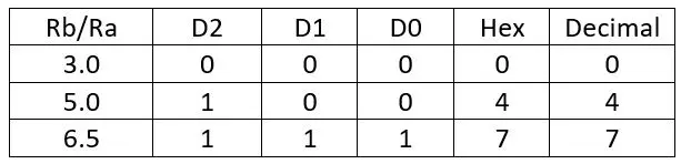 The resistor ratio is stored in a 3-bit register and can be 8 different values ranging from 3 to 6.5. The resistor ratio set to 5 is represented as (1,0,0).