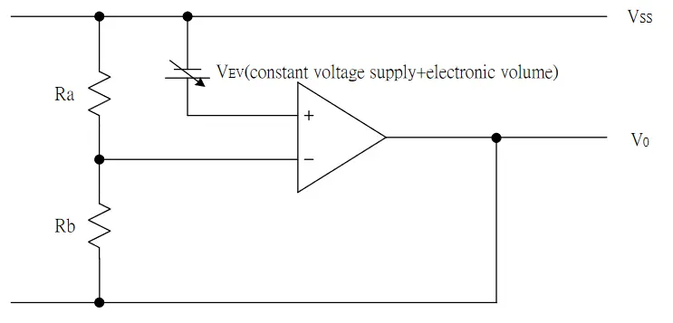 It is important to note that the capacitors (1µF-4.4µF) are connected to the V0-V4 terminals for the voltage following circuit to be active. The voltage regulator (either internal or external) is composed of a voltage divider and is combined with an op-amp for the voltage follower circuit. The following relationship is maintained between V0 and Vout as it applies to the voltage divider.