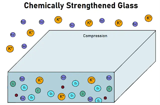 Chemically strengthened glass is strengthened through the process of chemical bonding. The glass is submerged in chemicals at a high heat which enables ions to bond to voids in the glass. The chemical process adds potassium bonds in the place of the original sodium bonds during this chemical reaction. This process strengthens the glass while maintaining the clarity of the glass.