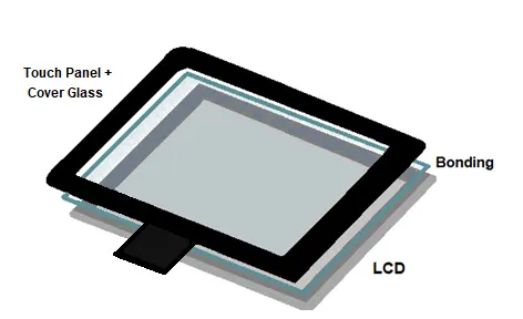 The cover glass of a display is fixed to the LCD with tape or with an OCA bonding material. OCA bonding is an optical clear adhesive that holds the touch panel, cover glass, and LCD together. The adhesive is clear and will dry without smudging the glass of the display.