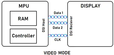 The MIPI DSI protocol offers two modes: command and video. The video mode is used when the display does not have access to internal RAM. The video mode sends the data from the processor to the display in a continuous stream. The MPU is required to stream the data which increases the bandwidth of the system processor.