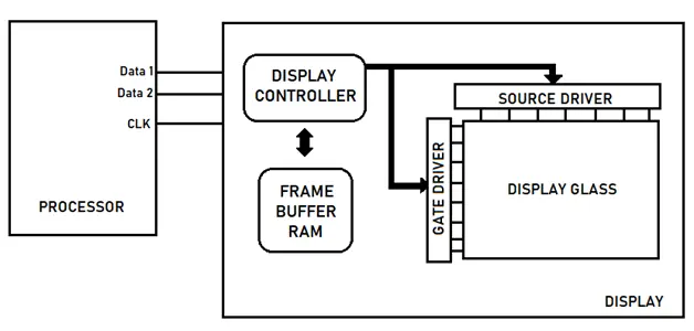 The frame buffer can be stored in the internal display RAM and accessed by the display controller IC. The image data is written to display RAM by the controller through specified commands. Other commands are used to specify color format, voltage settings and data types. In this scenario, the display does all of the heavy lifting. This frees up the microprocessor for other processes and the display can operate while the MPU is idle.