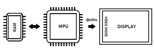 The microprocessor interfaced with the display can provide the memory for display data. This method is used when there is not memory provided internally by the display. Storing the data internally in the processor provides efficient access to display data that can be quickly sent to the display. Using memory internal to the processor is the fastest method for transmitting data. The MPU can read from and write to internal RAM and communicate it to the display through the DSI at high speeds.